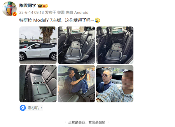 你的位置:AG麻将糊了注册网址 > 新闻动态 > 知名车评人“陈震同学”体验7座特斯拉Model Y 网友:犯了天条吗